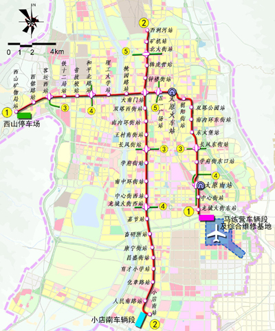 太原市軌道交通1號線一期工程起于西山礦務局,終于龍城大街東站,于太原市內呈倒“L”形分布,東西向沿迎澤大街,途經客運西站、理工大學、大南門、柳巷、五一廣場、太原站等客流集中點,南北向沿朝陽街、太行路、馬練營路敷設,途經朝陽街服裝城、雙塔公園、東太堡、太原南站綜合交通樞紐等地。1號線一期工程是聯系迎澤、武宿兩個市級中心和太原站、太原南站兩個鐵路交通樞紐的骨干線路,線路全長約24.07km,設橋梁1座,長約0.215km,其余全為地下線;共設置車站21座,全部為地下站,在線路西端設西山礦務局停車場1座、南端設馬練營車輛段及綜合維修基地1座,全線網共享控制中心1個。太原市軌道交通1號線于2010年完成工程可行性研究報告初稿,擬采用6輛編組的B型車、1500V接觸網供電,估算總投資157.9億元,計劃2013年開工建設,2017年建成通車。1號線是太原市先期啟動建設的軌道交通線路之一,是一條客流需求和規劃引導兼顧的大運量線路,在太原市軌道交通線網中具有重要的地位和作用,其建設可改善迎澤和武宿兩大市級中心的居民出行條件,緩解中心城區交通壓力,對引導沿線城市健康有序發展、土地合理使用及加快城市化進程等均有積極促進作用。