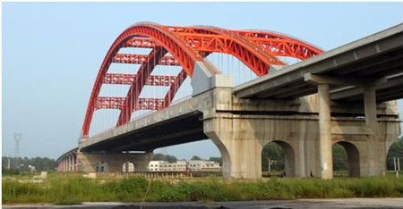 河南嶺南高速公路蒲山特大橋全長1703米,橋面寬度38.8米,主跨拱橋跨度達225米,拱肋最高處距地面72米,設計車速是120km/h,雙向六車道,主跨跨度為225米,為下承式剛性系桿鋼管混凝土拱橋。該橋位于連接二(連浩特)廣(州)高速與許(昌)平(頂山)南(陽)高速聯絡線上,上跨南水北調總干渠和焦(作)柳(州)鐵路,是河南省南陽市北繞城高速公路的重要控制性工程。該項目榮獲2010-2011年度國家優質工程銀獎。